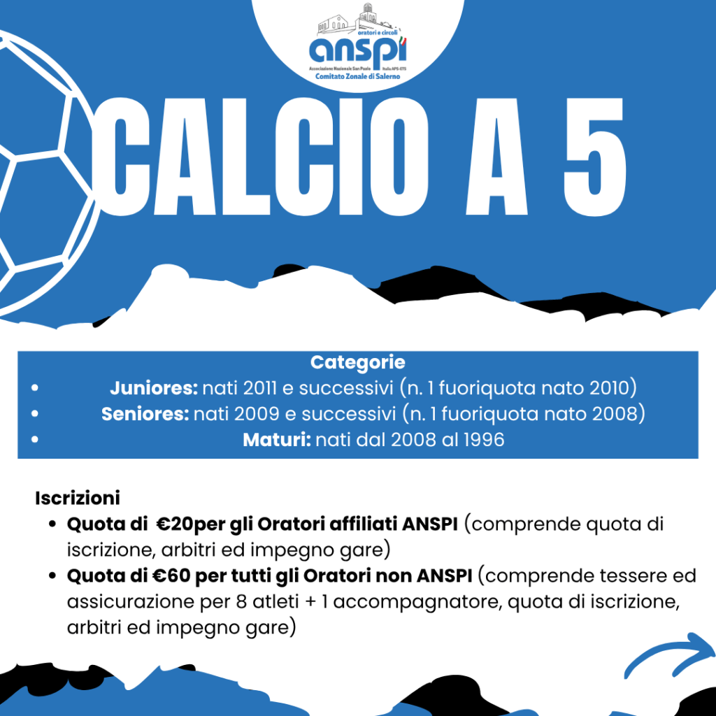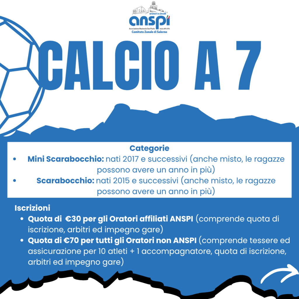 Il Torneo “Oratori… in Campo 2026” organizzato dal Comitato Zonale ANSPI Salerno con la collaborazione dell’Ufficio Sport e Tempo Libero dell’Arcidiocesi di Salerno-Campagna-Acerno si divide in 2 tornei: calcio a 5 e 7, con le rispettive categorie (scorri in basso). I Tornei sono aperti non solo agli Oratori ANSPI, ma anche a tutti gli Oratori ed alle squadre della nostra Arcidiocesi, che vogliano giocare con altre realtà del territorio.