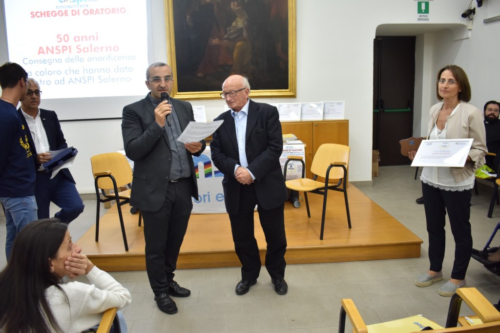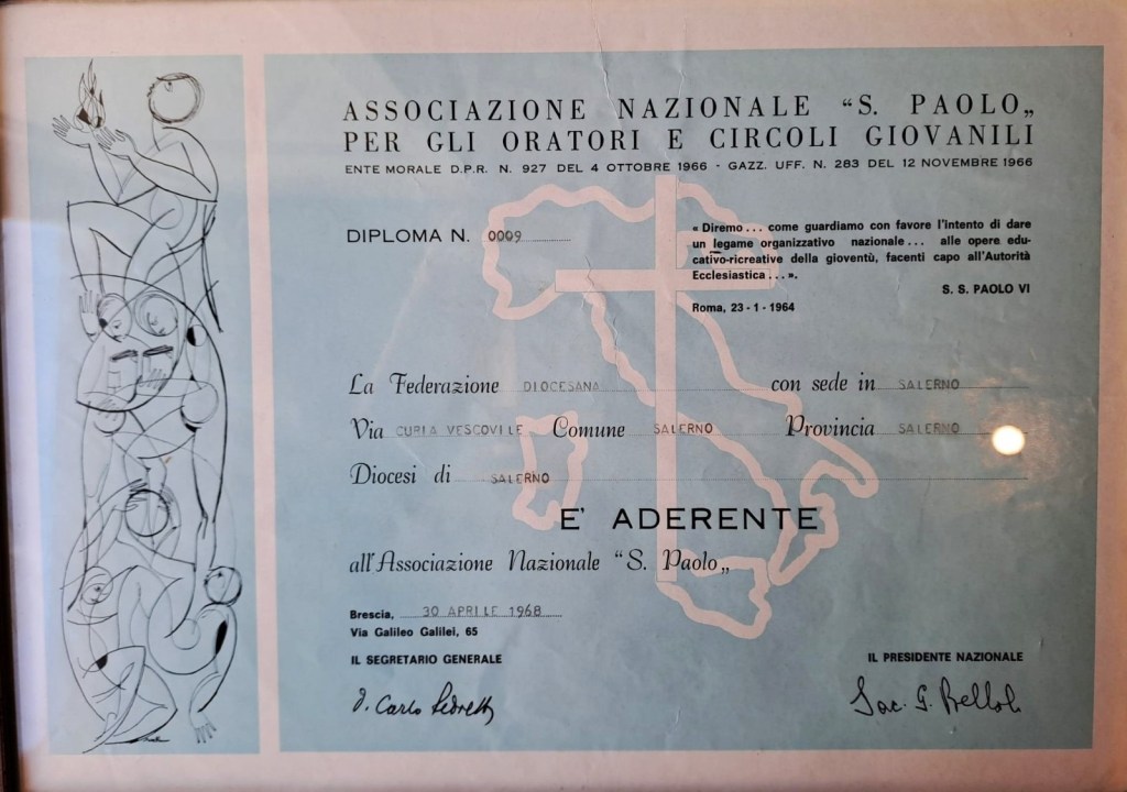 L’ATTESTATO DELLA PRIMA ADESIONE E NASCITA DEL COMITATO ZONALE DI SALERNO ALL’A.N.S.P.I., FIRMATO DALL’ALLORA PRESIDENTE MONS. GIOVAN BATTISTA BELLOLI,NONCHE’ IL FONDATORE DELL’ASSOCIAZIONE